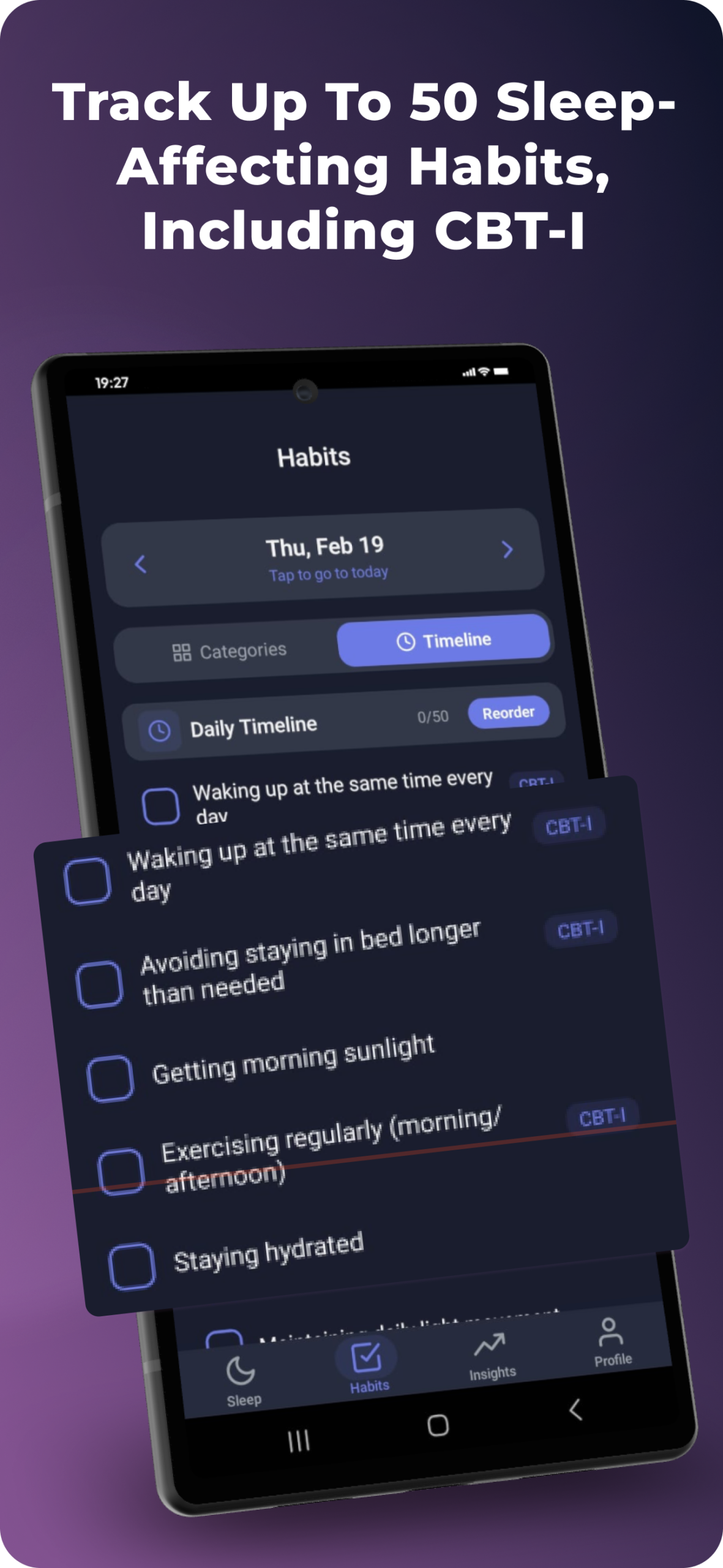 Get practical in-app tips and CBT‑I–based guidance designed to help you build healthier sleep habits and improve your sleep quality.