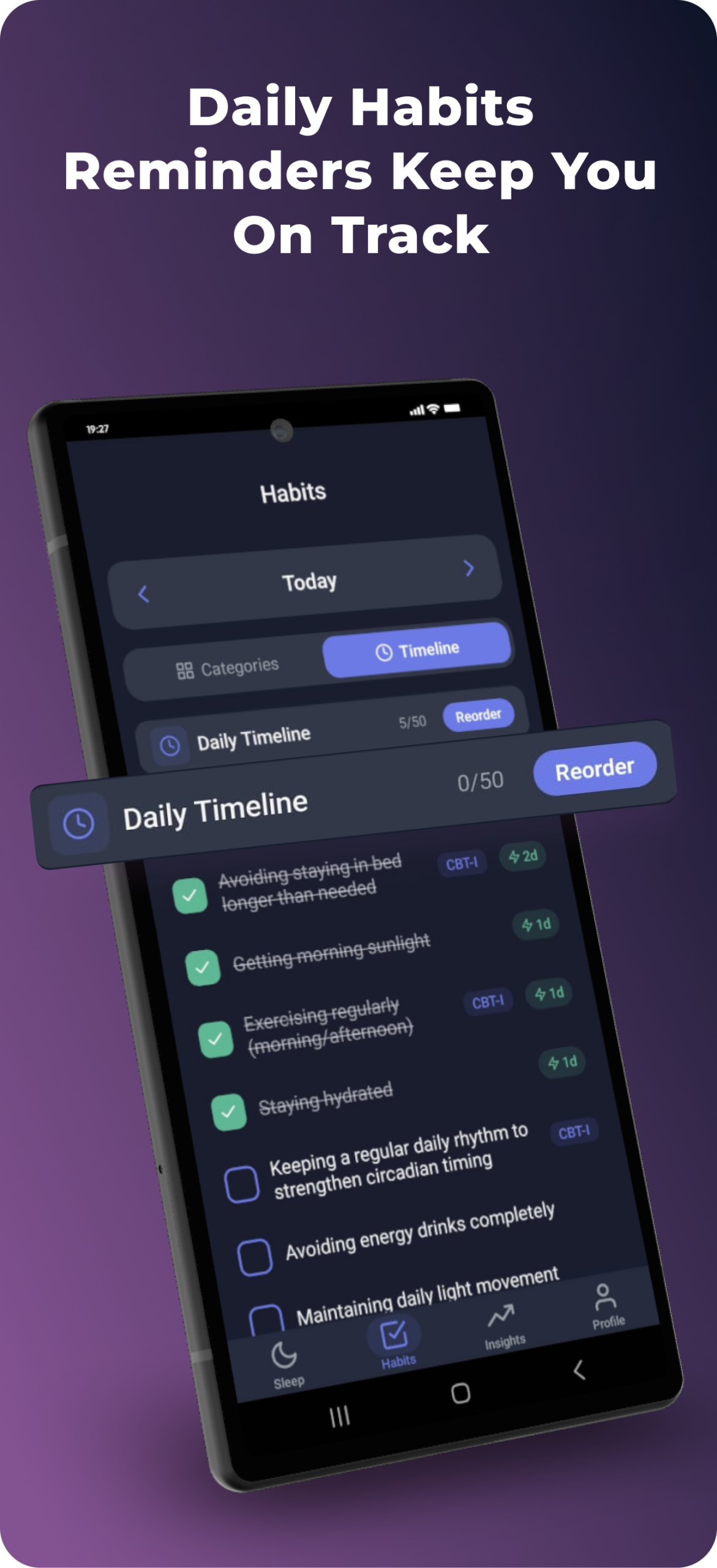 Get practical in-app tips and CBT‑I–based guidance designed to help you build healthier sleep habits and improve your sleep quality.